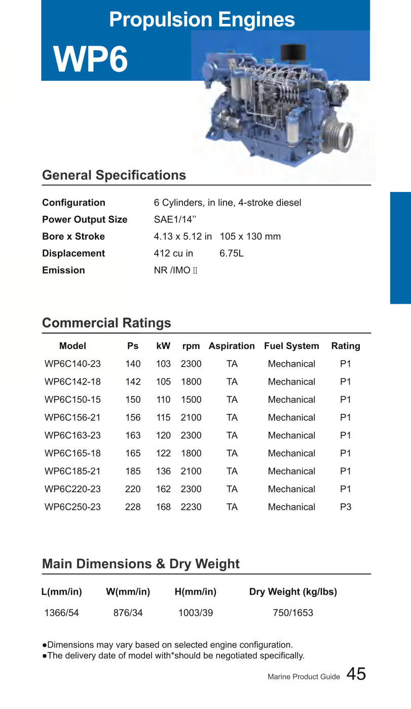 The Weichai WP6 Series Marine Diesel Engine is engineered for high-performance applications in marine environments. With power outputs ranging from 103 kW to 168 kW, it is suitable for various vessels, including passenger ships, cargo boats, and fishing vessels.